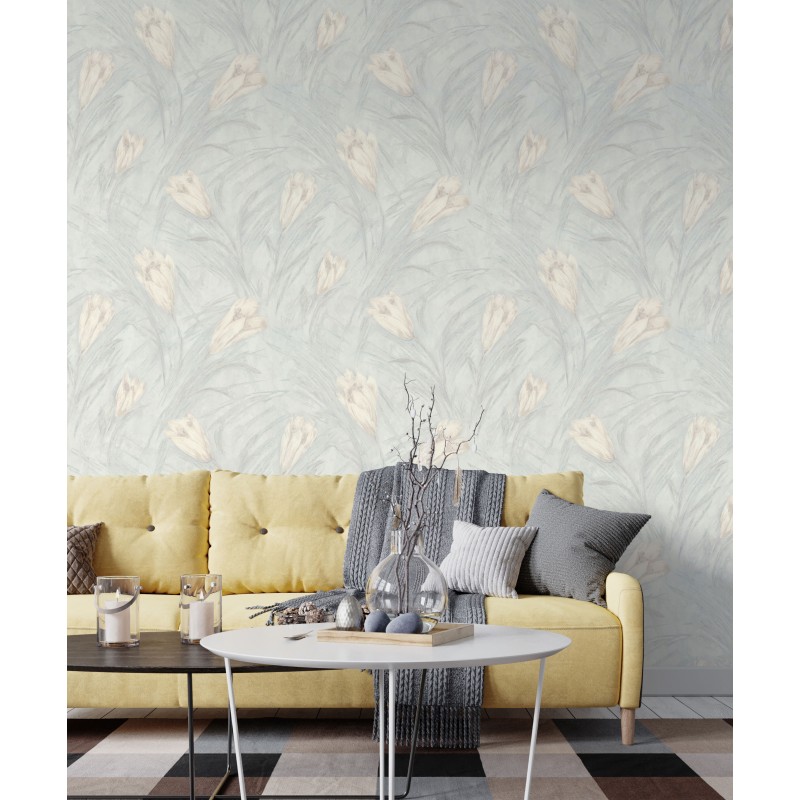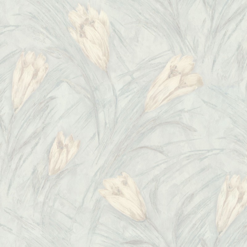 Бутоны выполнены широкими мазками, будто от кисти художника. Покрытые перламутром и россыпями глиттера, они словно блестят на солнце. Травинки на заднем плане мотива также покрыты перламутром, из-за чего создается впечатление, будто вся композиция сияет и переливается. Фон коллекции имитирует грубую текстуру штукатурки, что контрастирует с роскошным мотивом, но от того лишь подчеркивает его изящность и красоту.