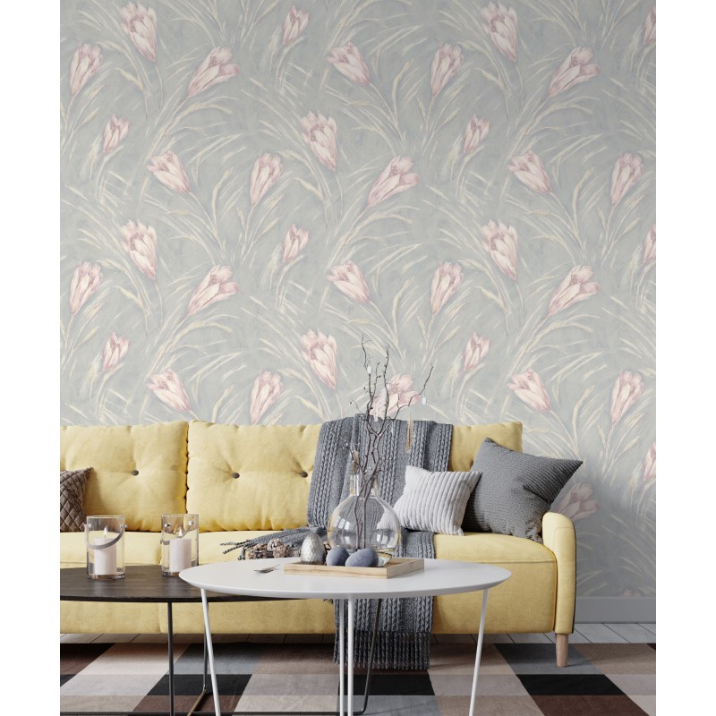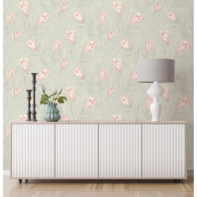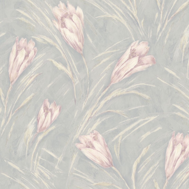 Бутоны выполнены широкими мазками, будто от кисти художника. Покрытые перламутром и россыпями глиттера, они словно блестят на солнце. Травинки на заднем плане мотива также покрыты перламутром, из-за чего создается впечатление, будто вся композиция сияет и переливается. Фон коллекции имитирует грубую текстуру штукатурки, что контрастирует с роскошным мотивом, но от того лишь подчеркивает его изящность и красоту.