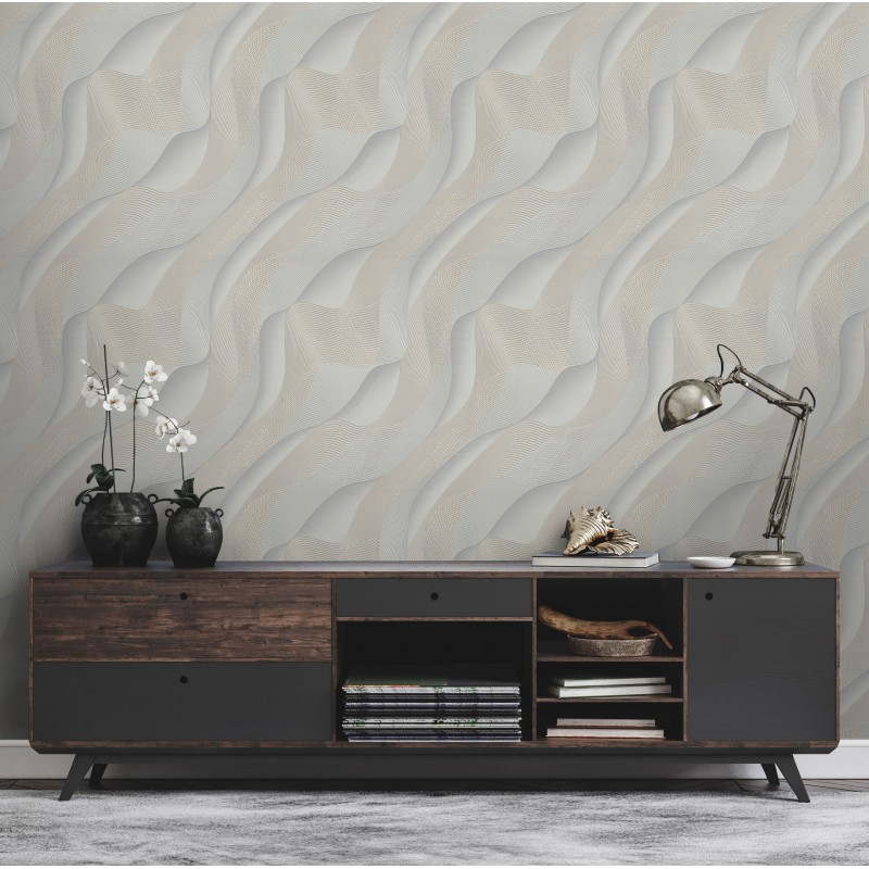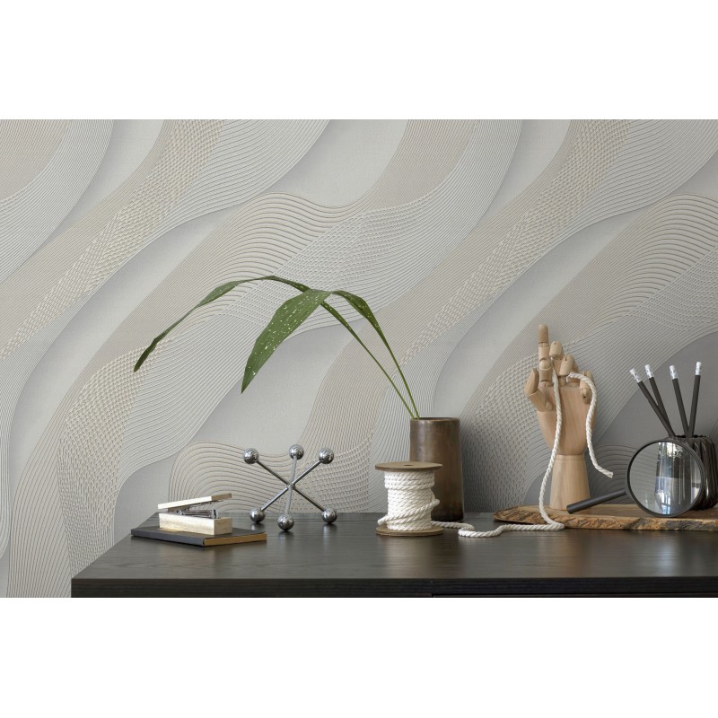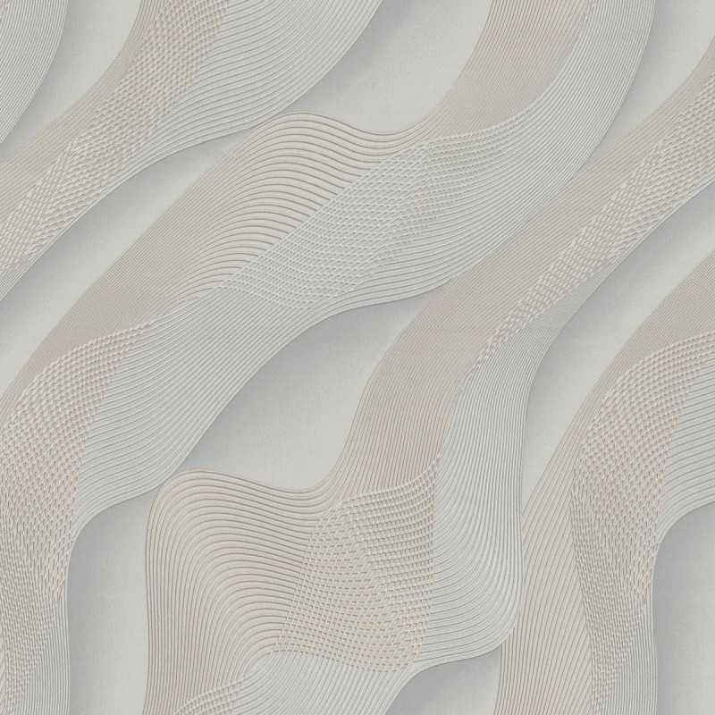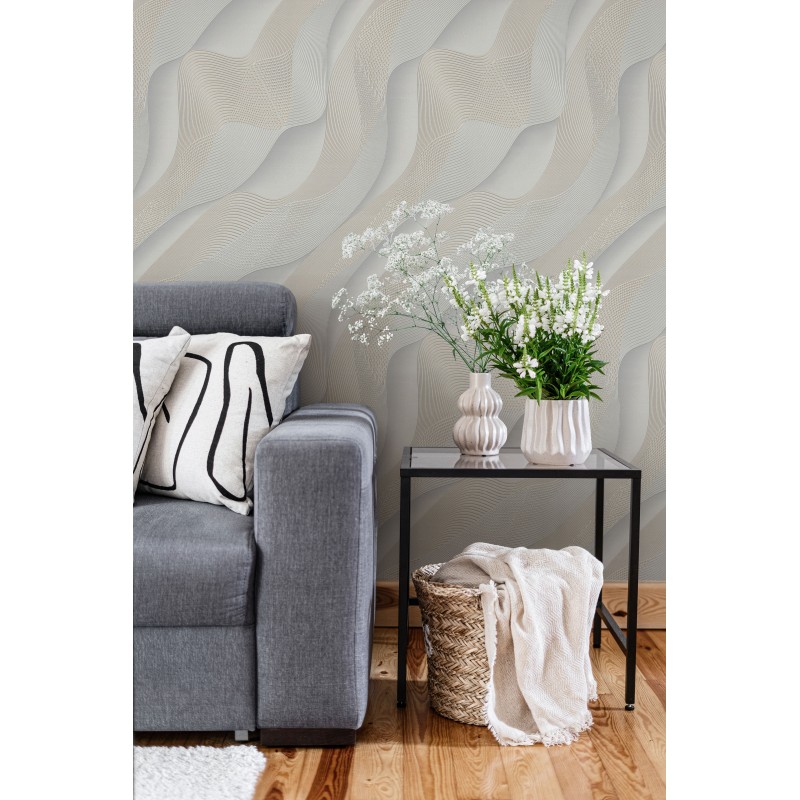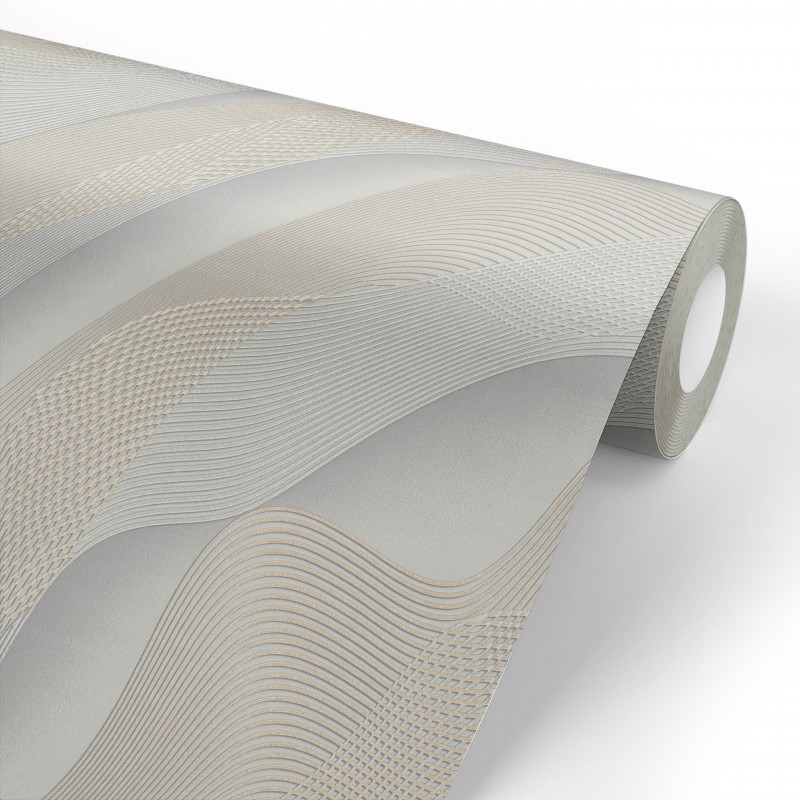 Абстрактный волнообразный орнамент лег в основу мотива. Непрерывные линии разных цветов, проходящие через все полотно по диагонали, пересекаются между собой и образуют многослойный сетчатый узор. Сужаясь и расширяясь, накладываясь друг на друга в своем движении, они делают композицию динамичной и глубокой. Визуальные спецэффекты придают особую детализацию и отчетливо проявляют каждую линию орнамента. Локальное наложение мелкого глиттера добавляет естественного сияния, подчеркивая геометрический рисунок полотна. Спокойный фон коллекции «Continuum» имитирует текстуру необработанной бетонной поверхности. Такой рельеф вместе с разносторонним тиснением и деликатным наложением слюды делают его отличным дополнением к основному мотиву.