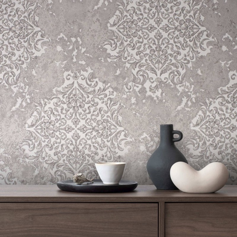 На этот раз фабрика отдала предпочтение светлым тонам, необычному орнаменту-фреске тон в тон и плотному рельефному фону-компаньону, который стыкуется без подгонки.