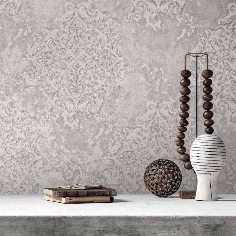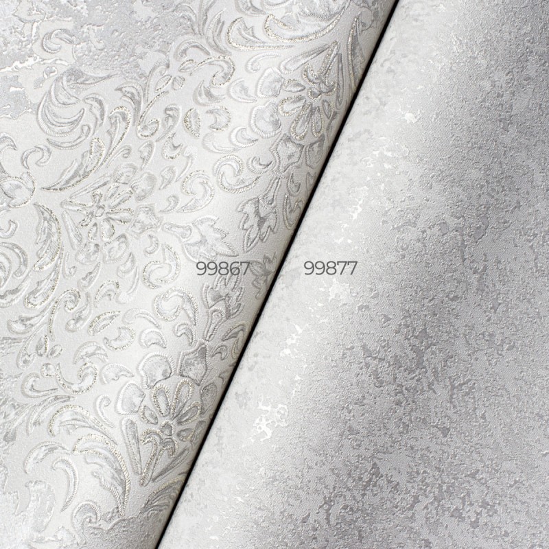 На этот раз фабрика отдала предпочтение светлым тонам, необычному орнаменту-фреске тон в тон и плотному рельефному фону-компаньону, который стыкуется без подгонки.