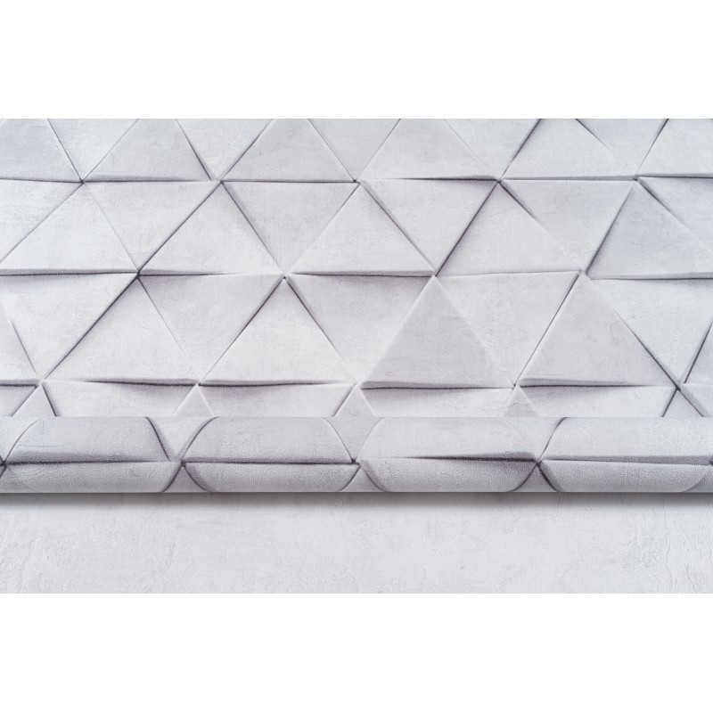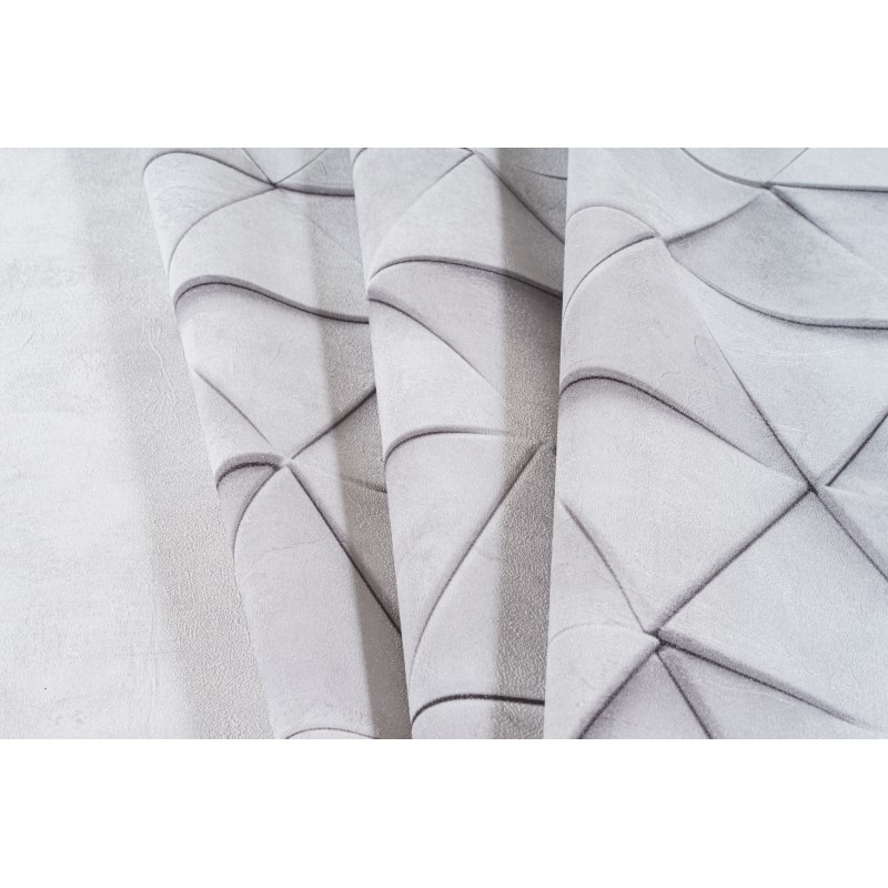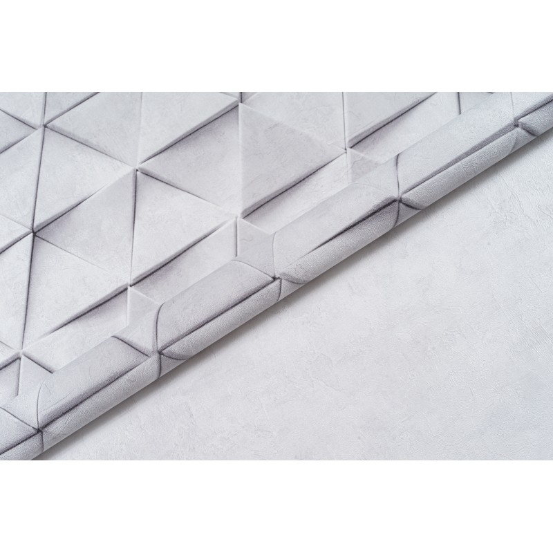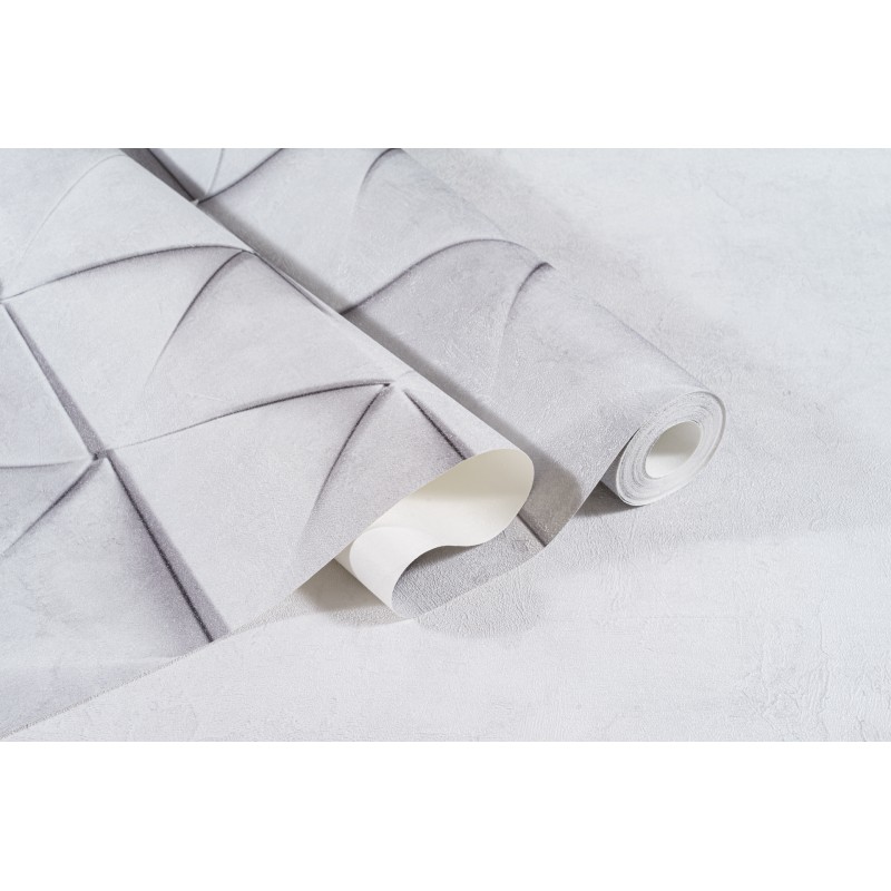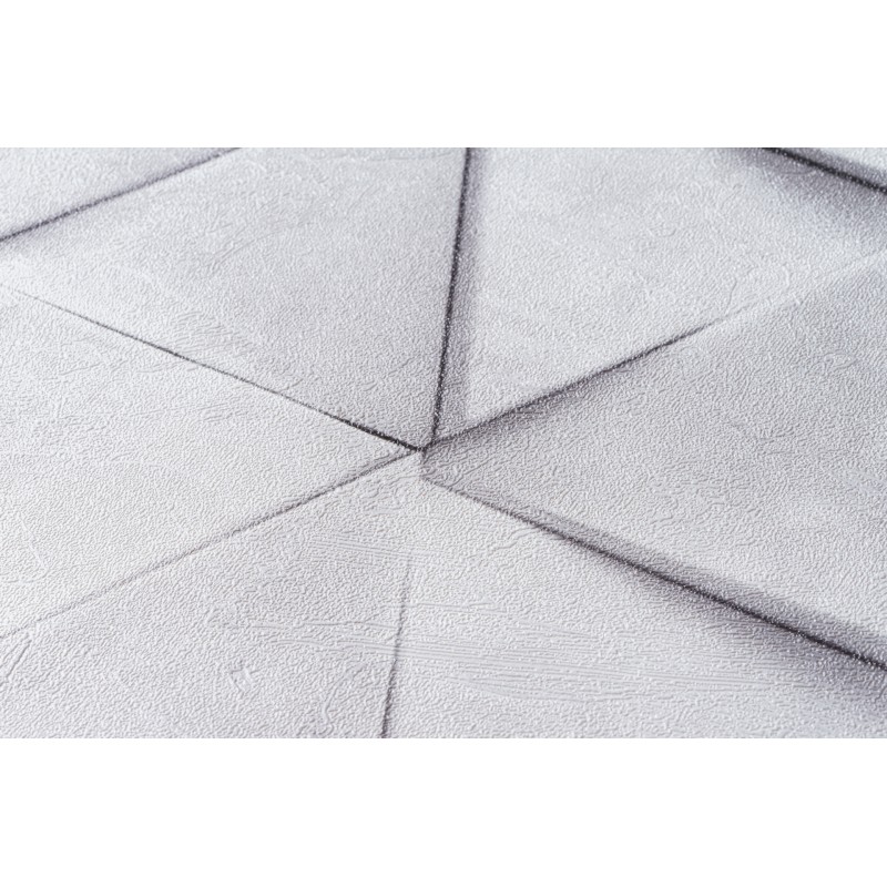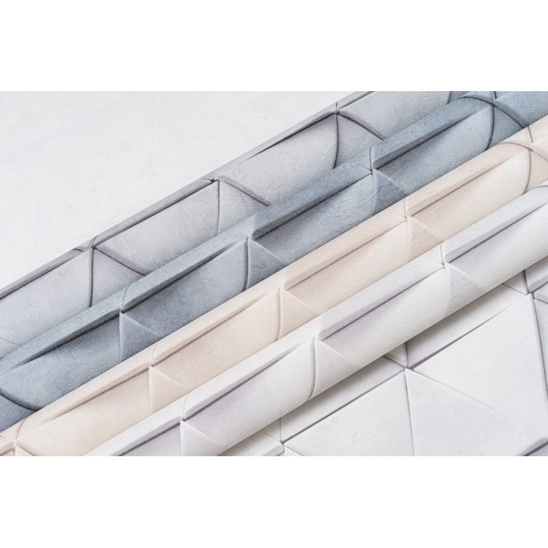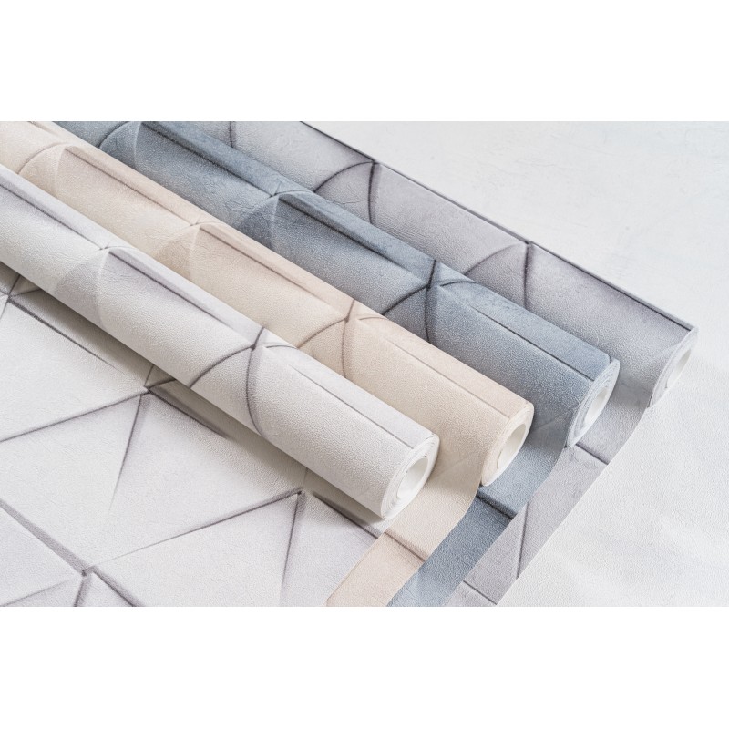Обои из коллекции «Нокс» представляют собой безупречную иллюзию объёма. Хочется протянуть руку, чтобы ощутить выступающие углы идеально выверенных треугольников. Подобный эффект достигается за счет филигранной игры света и тени, которая строится на контрасте светлого и более тёмного оттенков одной цветовой палитры. По своей текстуре обои напоминают матовую бетонную поверхность. Детально проработанная матрица узора также создает ощущение 3D объёма. В некоторых местах геометрические фигуры словно накладываются друг на друга, придавая изображению динамку и отвечая за ощущение упорядоченности в пространстве.