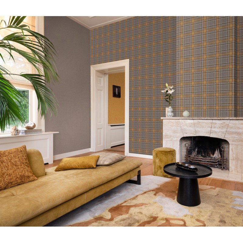 При создании коллекции не было сомнений, что достойную пару клетке составит фон с имитацией текстиля. Компаньон представлен в классической аристократической гамме: ирландский мох, ванильно-кремовый, теплый серый.