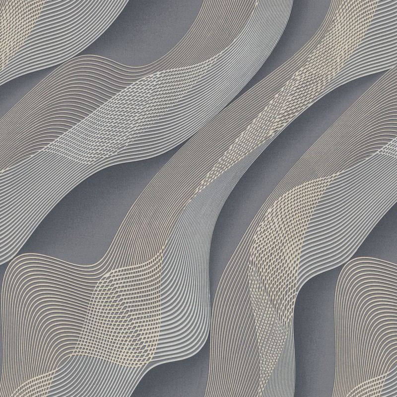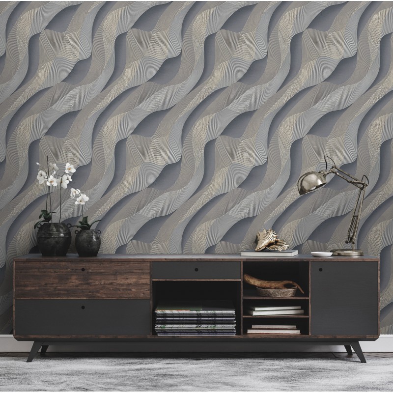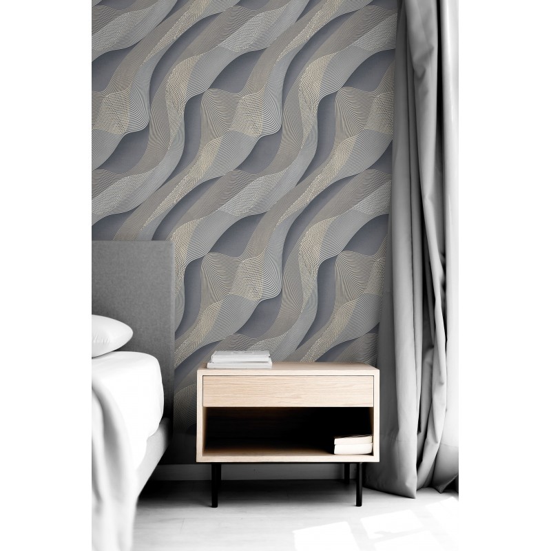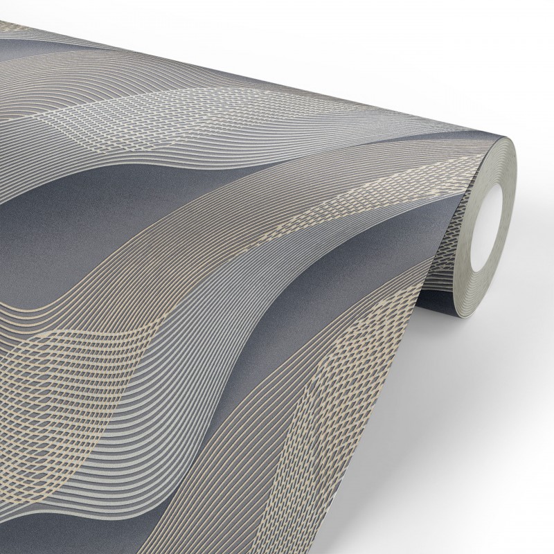Абстрактный волнообразный орнамент лег в основу мотива. Непрерывные линии разных цветов, проходящие через все полотно по диагонали, пересекаются между собой и образуют многослойный сетчатый узор. Сужаясь и расширяясь, накладываясь друг на друга в своем движении, они делают композицию динамичной и глубокой. Визуальные спецэффекты придают особую детализацию и отчетливо проявляют каждую линию орнамента. Локальное наложение мелкого глиттера добавляет естественного сияния, подчеркивая геометрический рисунок полотна. Спокойный фон коллекции «Continuum» имитирует текстуру необработанной бетонной поверхности. Такой рельеф вместе с разносторонним тиснением и деликатным наложением слюды делают его отличным дополнением к основному мотиву.
